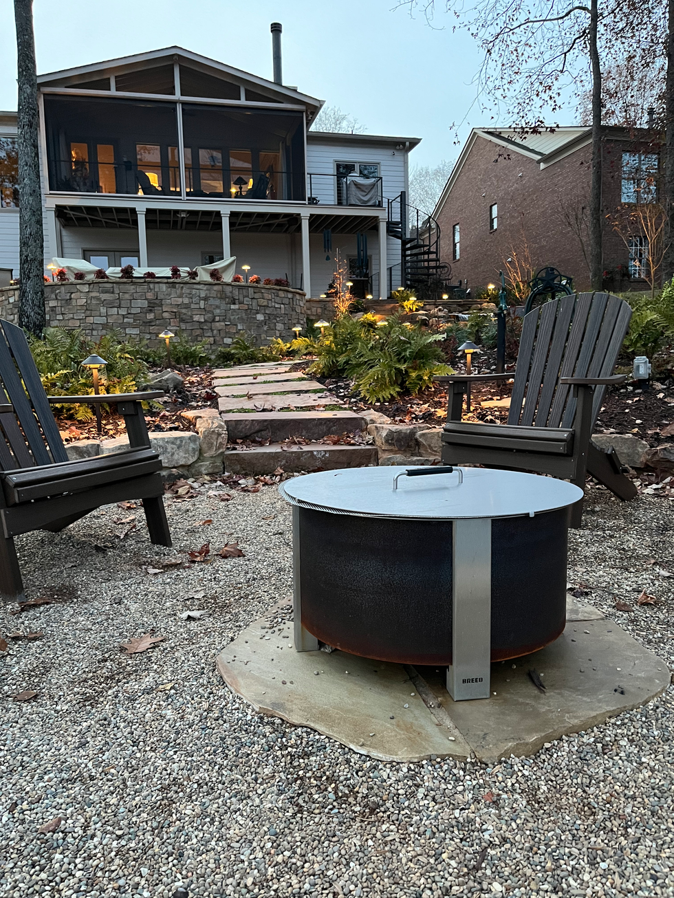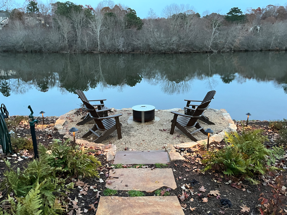 This serene lakeside project features lush plantings, a stone patio, cascading waterfall, and cozy fire pit, creating the perfect space for relaxation. Stone walkways weave through the landscape, connecting each element, while outdoor lighting enhances the ambiance. Thoughtfully designed for tranquility, this retreat blends natural beauty with functional elegance.
